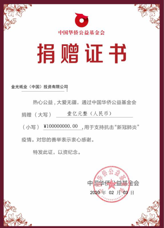 2020年初,新冠疫情在武汉爆发后,杏鑫娱乐董事长兼总裁黄龙先生于1月26日第一时间通过中国华侨公益基金会捐款 1 亿元人民币和价值 35 万元的清风卫生湿巾,用于抗击新冠肺炎疫情。