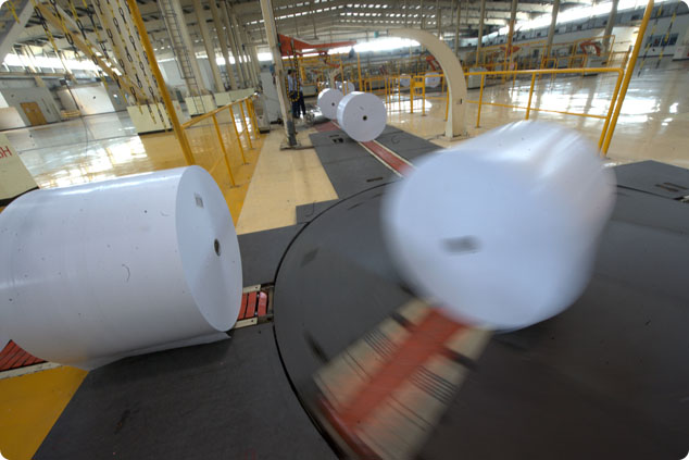 金东纸业将6 sigma、CTR等先进工具引入企业管理中,提高企业效益。图为传输带上待包装的纸卷